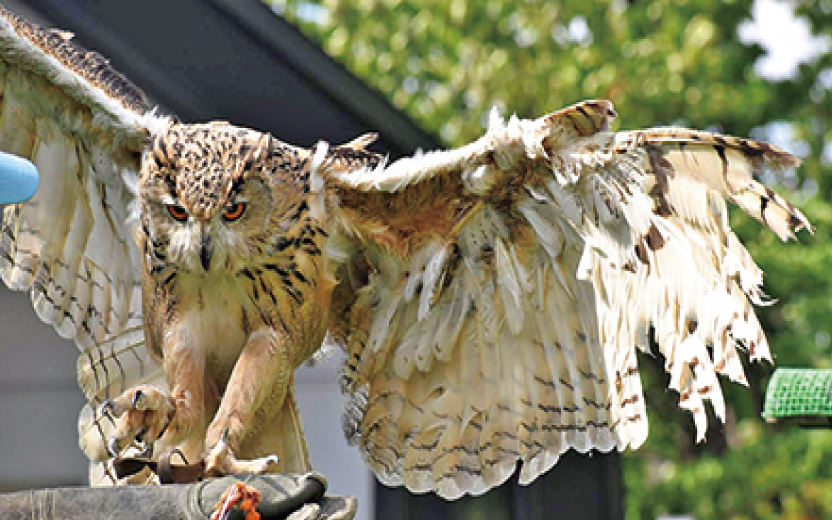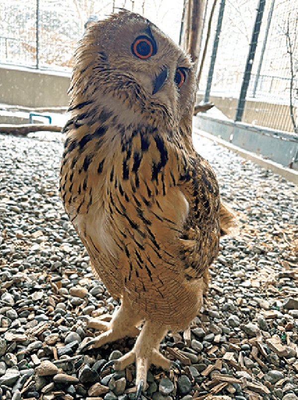 展示しているのはムーンです。最近、高齢のため目が見えづらくなっています。きれいな羽やオレンジ色の目、ふわふわの羽におおわれている大きな足など、ユーラシアワシミミズクの魅力を近くで見て、感じてもらいたいです。