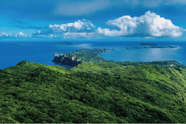 東京から南に約1,000km離れた位置にあり、「ボニンブルー」とよばれる美しい海と大小30ほどの島々からなります。オガサワラオカモノアラガイ、メグロ(鳥)などといった絶滅危惧種や小笠原諸島で進化してきた固有種が多数生息しています。