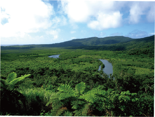 日本列島の南端部に位置する琉球列島の一部の島々。亜熱帯域に多雨林が発達している世界でもめずらしい地域です。ヤンバルクイナ、イリオモテヤマネコ、アマミノクロウサギなど、多数の絶滅危惧種が生息しています。