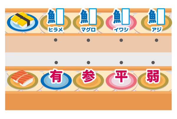 ● 答え ヒラメ→平(鮃) マグロ→有(鮪) イワシ→弱(鰯) アジ→参(鯵)