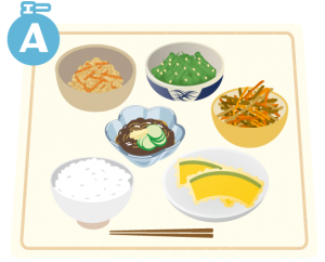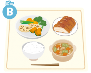 Bは、主食(ご飯)・主菜(とりの照り焼き)・副菜(ゆで野菜・野菜スープ)がそろっているから。Aは、主食・副菜のみで、主菜が足りない。