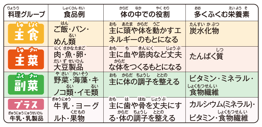 みんなの体は食べた物からできていて、毎日の食事がみんなの元気をつくっているよ。かたよった食事では、1日に必要な栄養を満たすことができない。だから、栄養バランスを考えて、いろいろな食品を組み合わせて食べることが大切。そのためにはまず、1日3食きちんと食べよう。