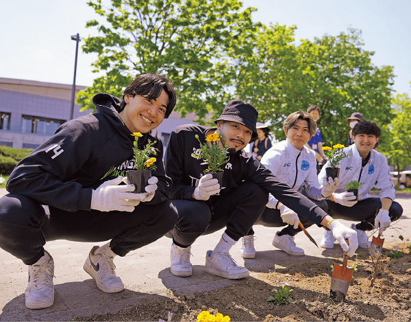 ホームアリーナ「北海きたえーる」前の歩道の花植え活動に参加しています。2025年は盛實海翔選手と星野京介選手が、エスポラーダ北海道の選手たちといっしょに、10カ所の植樹ますに豊平区の花のペチュニアなど計180株を、地元の方々と交流しながら植えました。