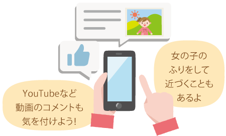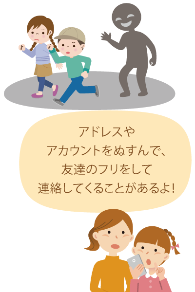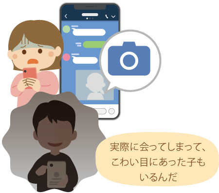 SNSで知り合った友達と写真を送り合ううちに、はだかの写真が欲しいと言われて送ってしまった子がたくさんいるよ。実際に会って誘拐されてしまった子もいるんだ。