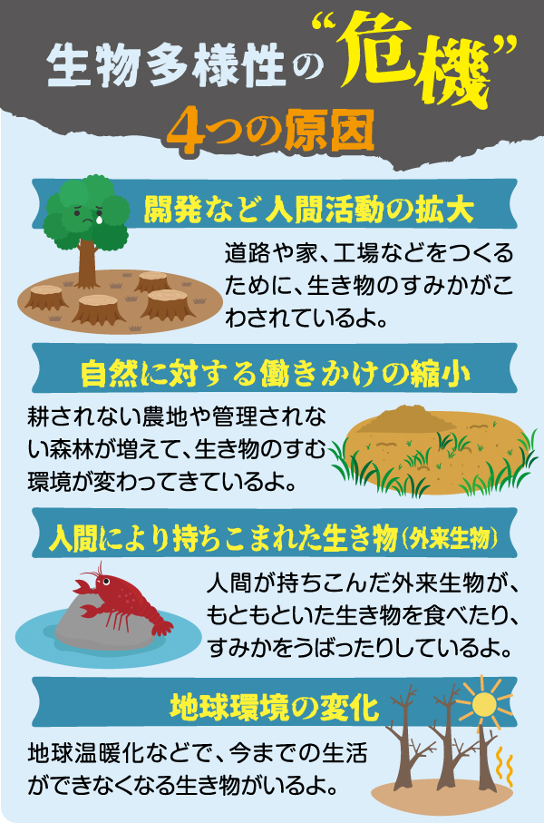 どうして生き物がどんどん減っているんだろう。大きな理由の1つは人間の活動なんだ。街が広がってすみかが無くなったり、外来生物が増えたりして、もともといた生き物が暮らしにくくなっているよ。生物多様性が失われると、自然のバランスがくずれてしまうんだ。ある生き物がいなくなると、その生き物を食べていた動物も困ってしまうし、植物の種を運ぶ生き物がいなくなると、森も元気がなくなってしまうよね。
