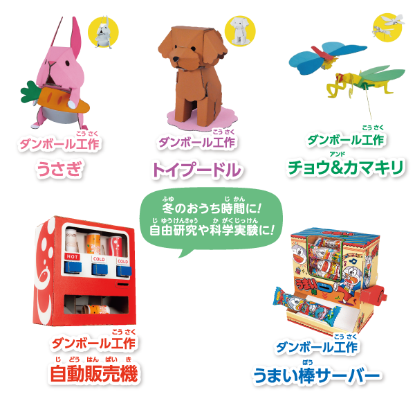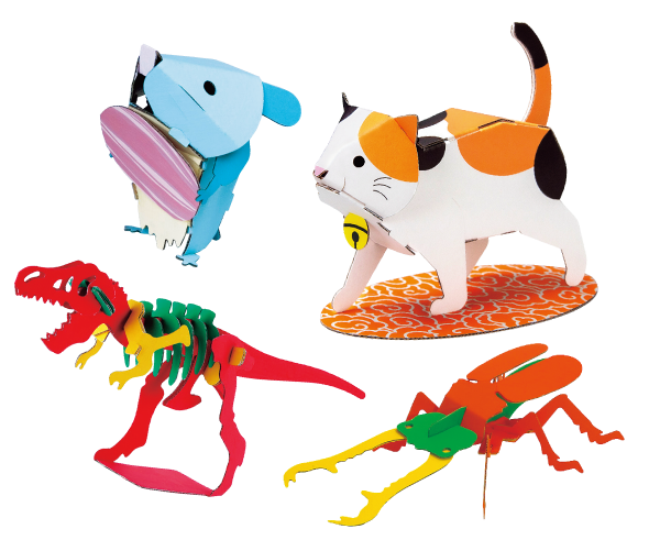 また、かわいい動物や昆虫などが作れるダンボール工作キットもあるよ。こちらもハサミやノリなどを使わずに組み立てることができるんだ。ティラノサウルスやネコ、ハムスター、ウサギ、クワガタ、カブトムシなど種類が豊富。好きな色を付けたらオリジナルの作品が完成するよ。