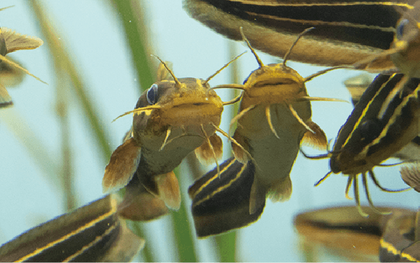 口は下向きについており、海底の小さな生き物を食べています。ゴンズイの口元にある長い8本のヒゲには、味やにおいを感じることのできる器官があります。水族園では、サクラエビやゴカイなどをあたえています。えさの時間には、ヒゲを使ってえさを探すようすを観察することができます。ぜひ、会いに来てください。