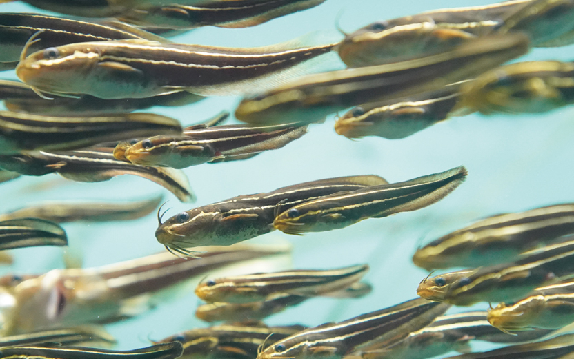 展示しているゴンズイは、全長10㎝前後です。もう少し小さかったころは数十尾が集まってかわいらしい玉を作っていましたが、成長とともにおたがいに少しはなれ、今では別々に泳ぐときもあります。