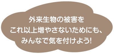 じゃあ外来生物は「悪い生き物」なのかな。外来生物は、運ばれた場所で一生懸命生きようとしているだけだよね。忘れてはいけないのは、外来生物にしてしまったのは人間だということ。これ以上、「悪い生き物」になってしまう生き物が増えないよう、みんなにできることを考えてみてね。
