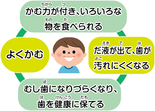・よくかんでだ液がたくさん出ると、むし歯になりにくくなる。
