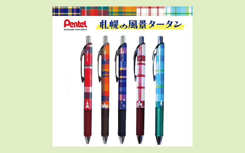 札幌の風景をタータンチェック柄で表現したエナージェル ボールペンが発売中だよ。さっぽろテレビ塔、北海道旧本庁舎とイチョウ並木、大通公園のイルミネーション、札幌市時計台、さっぽろ羊ヶ丘展望台をイメージした5種類が登場。