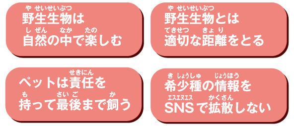 野生生物にせまる危機などについて、自分ごととしてとらえて行動してみよう。以下のような行動も、野生生物の保全には重要だよ。