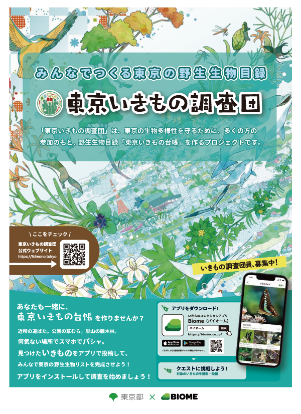 東京の生物多様性を守るために、デジタル版の東京の野生生物目録「東京いきもの台帳」を完成させていくプロジェクトだよ。スマホで生き物の写真をとって、アプリで投稿するだけでだれでも参加できるよ。ぜひ参加してね!
