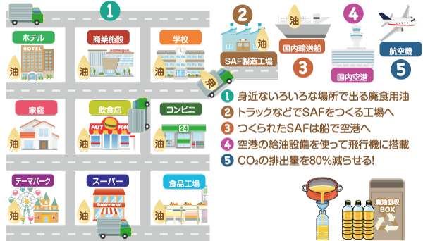 そして今、まちのごみを減らすだけでなく、海や川をよごす原因の1つでもある使い終わった食用油(廃食用油)を捨てずに活かす、新しい技術も広がっているよ。例えば廃食用油を集めて、飛行機の燃料である「SAF」というエネルギーに生まれ変わらせる取組も始まっているんだ。