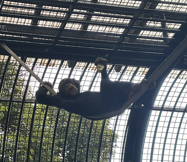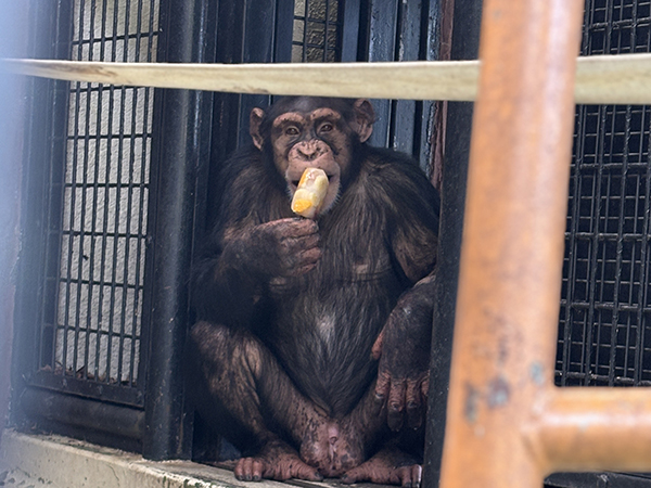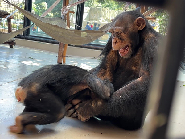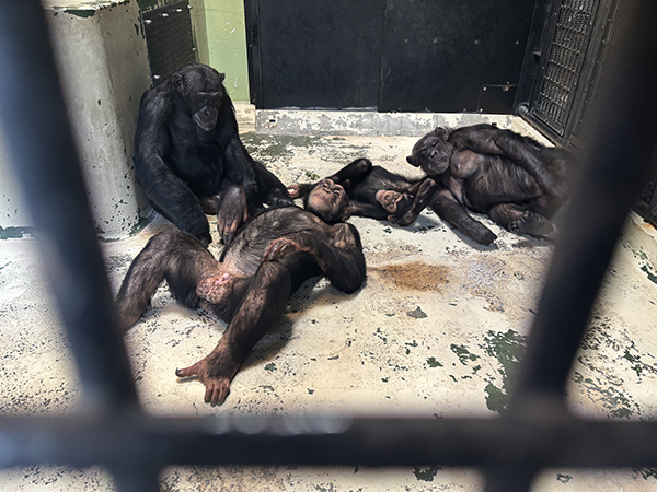 夏、外よりも冷房の効いた寝室で休むチンパンジーたち