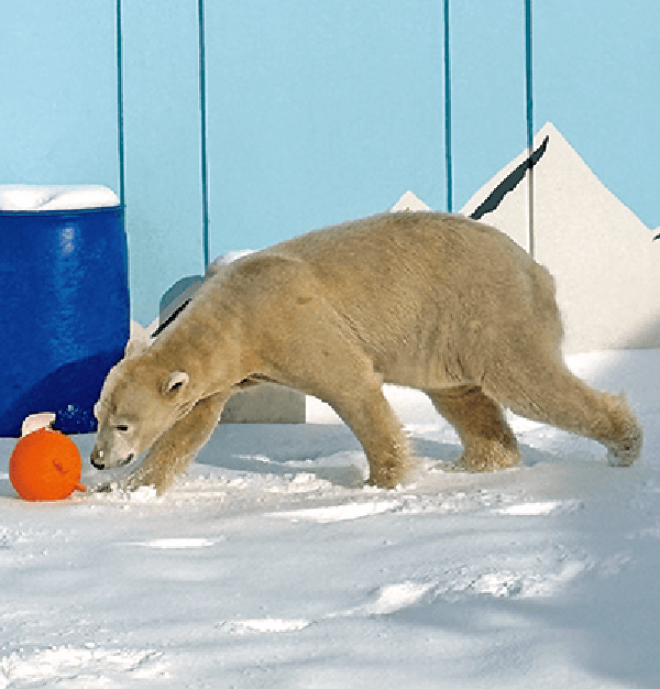 真っ白に見える体の毛は、本当は白くありません。1本1本はストローのように中が空洞になっていて透明です。光が反射して白く見えているだけなのです。さらに、毛の下のはだの色は黒!太陽の熱をぐんぐん吸収して、体を温めるために黒くなっています。寒い北極で生きるためのすごい工夫ですね。また、とても鼻が良く、遠くのアザラシのにおいを感じてかりに行けるほどです。真っ白な氷の世界で獲物を探すために、目よりも鼻をたよりにしています。動物園で、どのように鼻を使っているか観察してみてください。
