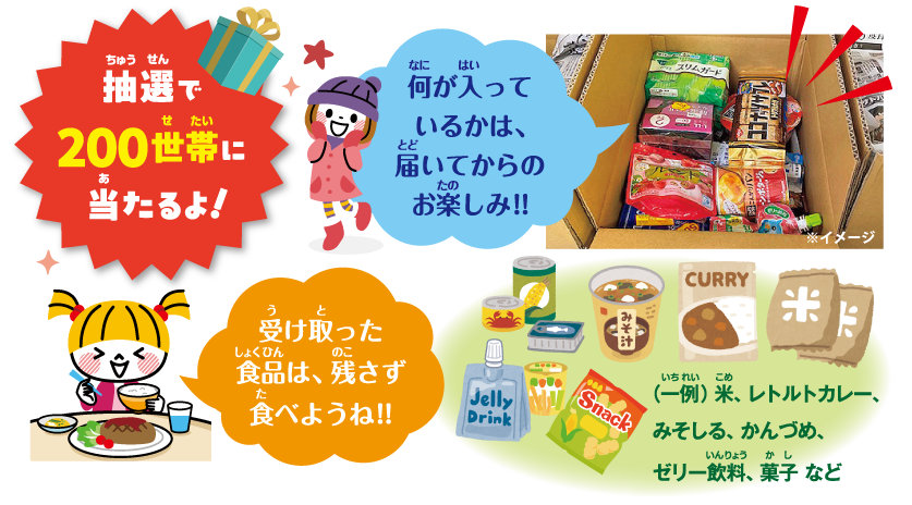 「フードバンクイコロさっぽろ」とエコチルがコラボした、いつも大人気のプレゼントキャンペーンを今年の冬休みも開催! 協賛企業から提供してもらった食品ロスとなってしまう食品を箱につめてプレゼントするよ。ぜひ、おうちの人といっしょに応募してね。