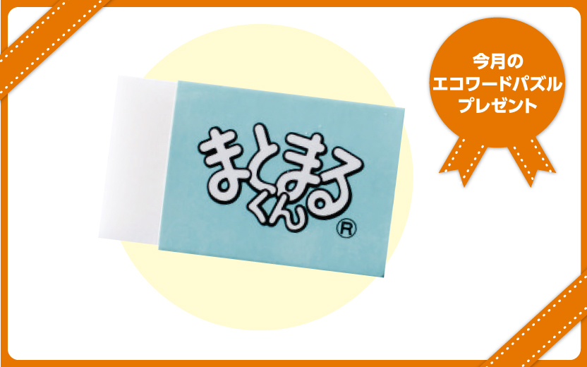 正解者の中から抽選で、ヒノデワシ株式会社 消しくずが散らばらない消しゴム まとまるくんを10名様にプレゼント!消しくずが散らばらない消しゴムだよ。消しくずがまとまり、消しゴムにくっつくから、机の上をいつも清潔に保てるんだ。ソフトタイプで力を入れなくてもよく消える!紙のケースは古紙配合率60%で、環境にも優しいよ。