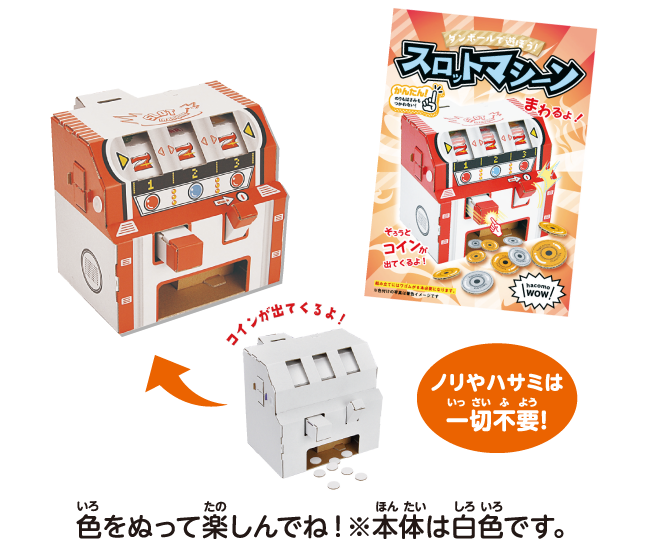 作った後も楽しいWOWシリーズ。ノリやハサミを使わない簡単組立! 数字・絵柄がそろうと、セットしたコインが出て来るよ! 作って、遊んで、家族、友人、 みんな集まって盛り上がろう!