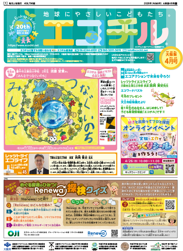 今月の巻頭特集は、「地球温暖化って何?暑くなると何が問題なの?エコアクションで未来を守ろう!」「まちのごみが海をよごす?!天ぷら油で飛行機が飛ぶ?!「ごみゼロアクション」と「SAF」で環境をまもる!」です。